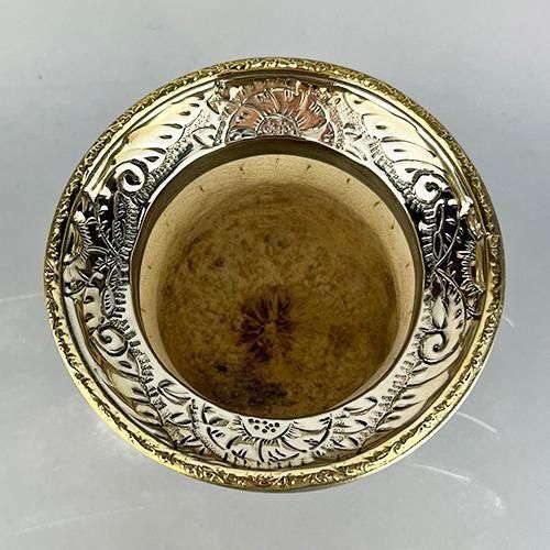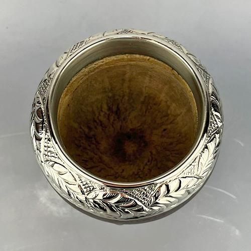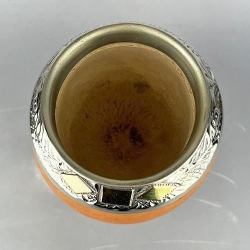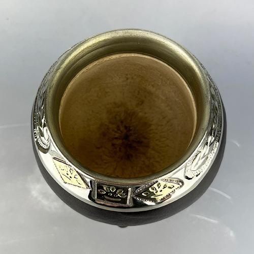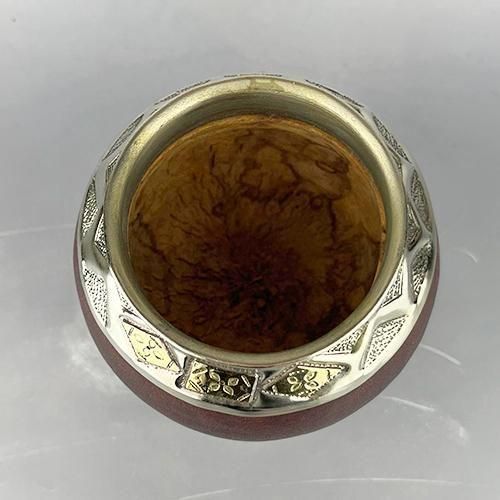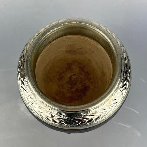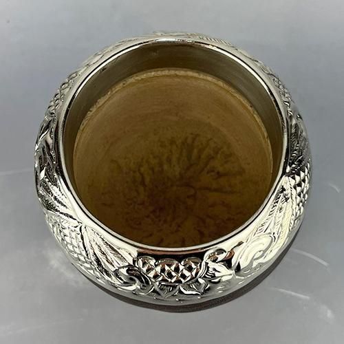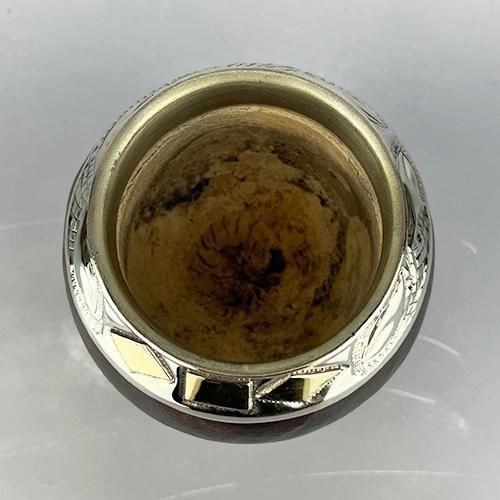 26,000円(税込28,600円)カラバサ(ひょうたん)に本革巻きで、口部金属は、アルパカ(洋白)に特殊加工が施され、シルバー(純銀)に似たジュエリーのような輝きを放つ、特別仕様のタイプが使用されています。 さらに、職人技とも言える細かな刻印による芸術的で美しい柄入りのスペシャルです。 ウルグアイを代表する上位モデルで、素晴らしいマテ壺です。 -