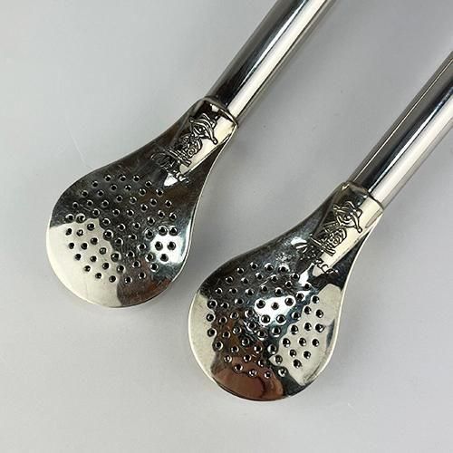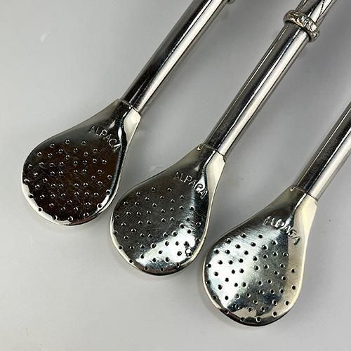 9,200円(税込10,120円)ウルグアイのアルパカ(洋白)製で、刻印入り、Wリング付き、飲み口には、ブロンズのプレーティングが施されたヘビー級超重厚感のある大変上質なボンビージャです。 太めのボンビージャで存在感もあり、大き目の壺によく似合います。吸い込んだ時の水分量も多いのでマテ茶の味もまた格別です。 -