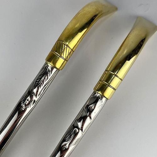 8,800円(税込9,680円)ウルグアイのアルパカ(洋白)製で、飲み口には、ブロンズのプレーティングが施された重厚感のある上質なボンビージャです。 太めのボンビージャで存在感もあり、大き目の壺によく似合います。吸い込んだ時の水分量も多いのでマテ茶の味もまた格別です。シンプルながらも花びら柄のような可愛いデザインです。口元で大きくカーブするピコデロロタイプです。 -