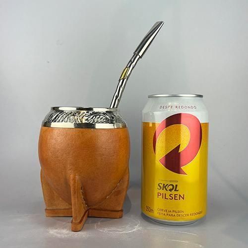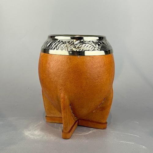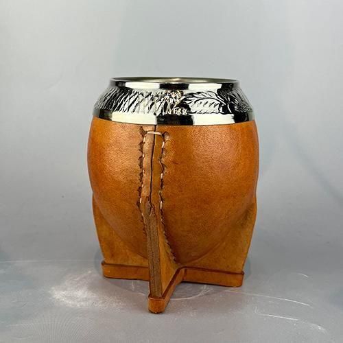 カラバサ(ひょうたん)に、口部金属は、アルパカ(洋白)に刻印入りで本革巻きです。ウルグアイを代表する人気の丸型の上位モデルで、程よいサイズ感、シルエット、レザーの質感や縫製等、非常に良い作りで総合点の高いマテ壺です。