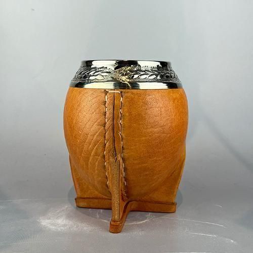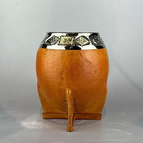 かカラバサ(ひょうたん)に、口部金属は、アルパカ(洋白)に刻印入り、さらにブロンズの飾り付きで本革巻きです。ウルグアイを代表する人気の丸型の上位モデルで、程よいサイズ感、シルエット、レザーの質感や縫製等、非常に良い作りで総合点の高いマテ壺です。