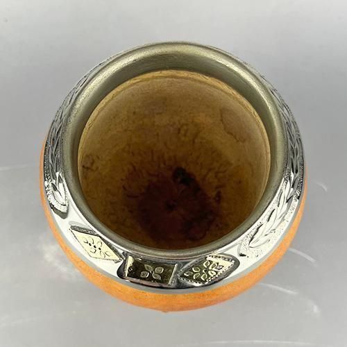 カラバサ(ひょうたん)に、口部金属は、アルパカ(洋白)に刻印入り、さらにブロンズの飾り付きで本革巻きです。ウルグアイを代表する人気の丸型の上位モデルで、程よいサイズ感、シルエット、レザーの質感や縫製等、非常に良い作りで総合点の高いマテ壺です。