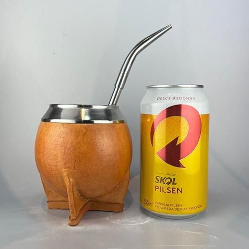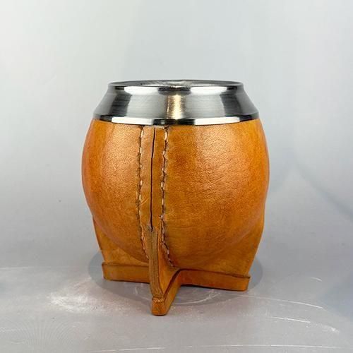 カラバサ(ひょうたん)に、口部金属は、ステンレスで本革巻きです。ウルグアイを代表する人気の丸型の定番モデルで、程よいサイズ感、シルエット、レザーの質感や縫製等、非常に良い作りで総合点の高いマテ壺です。こちらは、染色なしのいわゆるヌメ革です。使用と経年による味わい深い変化を楽しめます。