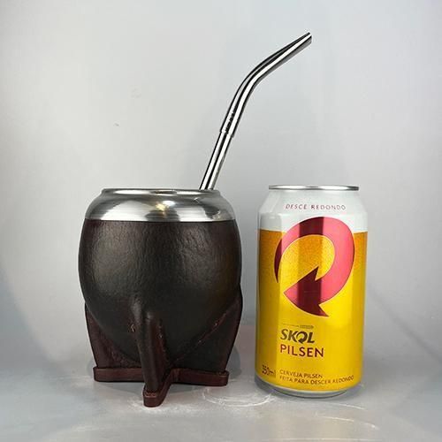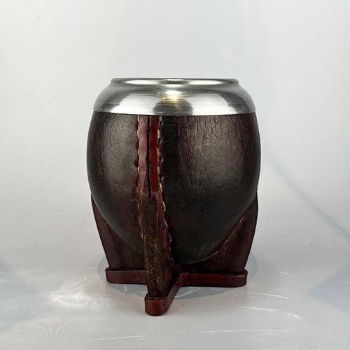 カラバサ(ひょうたん)に、口部金属は、ステンレスで本革巻きです。ウルグアイを代表する人気の丸型の定番モデルで、程よいサイズ感、シルエット、レザーの質感や縫製等、非常に良い作りで総合点の高いマテ壺です。比較的大きめ(インサイド容量)です。