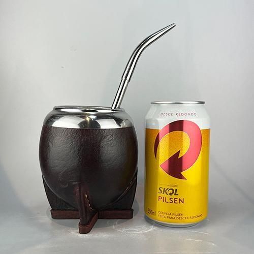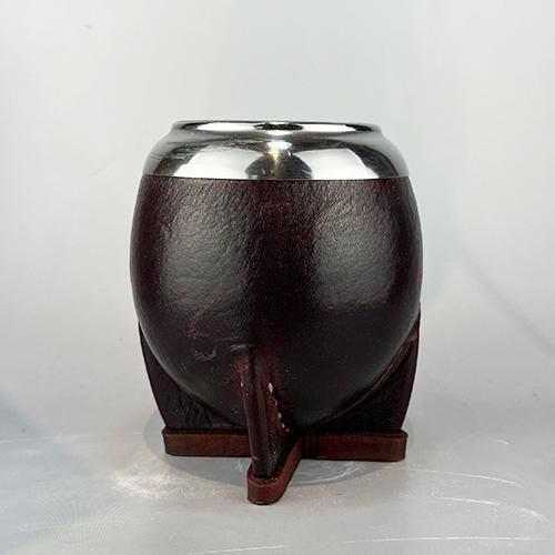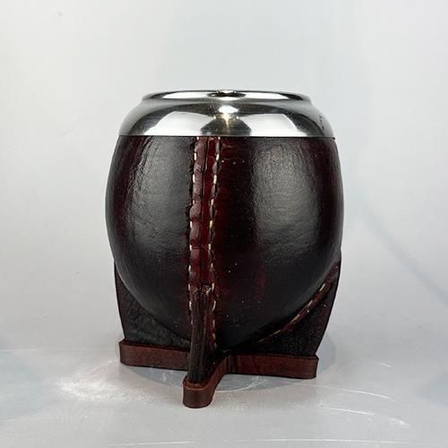カラバサ(ひょうたん)に、口部金属は、ステンレスで本革巻きです。ウルグアイを代表する人気の丸型の定番モデルで、程よいサイズ感、シルエット、レザーの質感や縫製等、非常に良い作りで総合点の高いマテ壺です。比較的大きめ(インサイド容量)です。