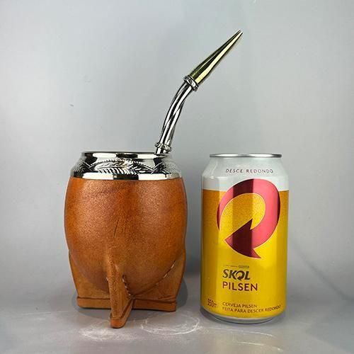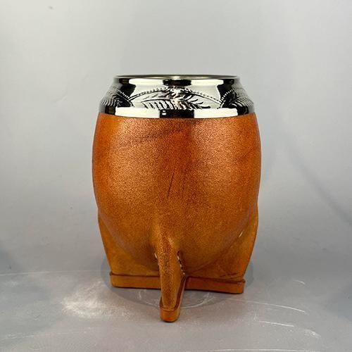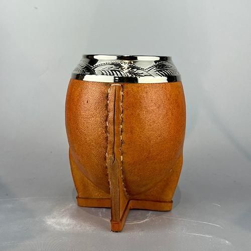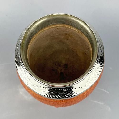 カラバサ(ひょうたん)に、口部金属は、アルパカ(洋白)に刻印入りで本革巻きです。ウルグアイを代表する人気の丸型の上位モデルで、程よいサイズ感、シルエット、レザーの質感や縫製等、非常に良い作りで総合点の高いマテ壺です。