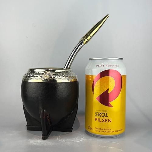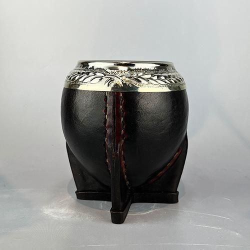 カラバサ(ひょうたん)に、口部金属は、アルパカ(洋白)に刻印入りで本革巻きです。ウルグアイを代表する人気の丸型の上位モデルで、程よいサイズ感、シルエット、レザーの質感や縫製等、非常に良い作りで総合点の高いマテ壺です。