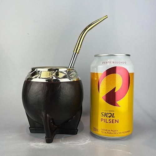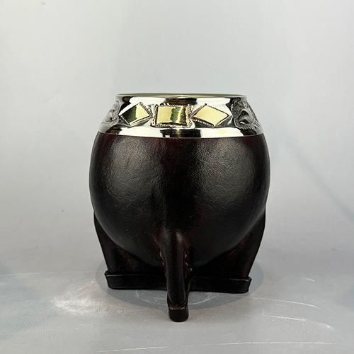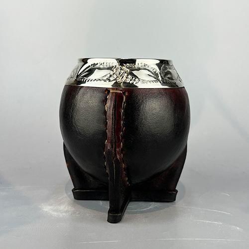 カラバサ(ひょうたん)に、口部金属は、アルパカ(洋白)に刻印入り、さらにブロンズの飾り付きで本革巻きです。ウルグアイを代表する人気の丸型の上位モデルで、程よいサイズ感、シルエット、レザーの質感や縫製等、非常に良い作りで総合点の高いマテ壺です。